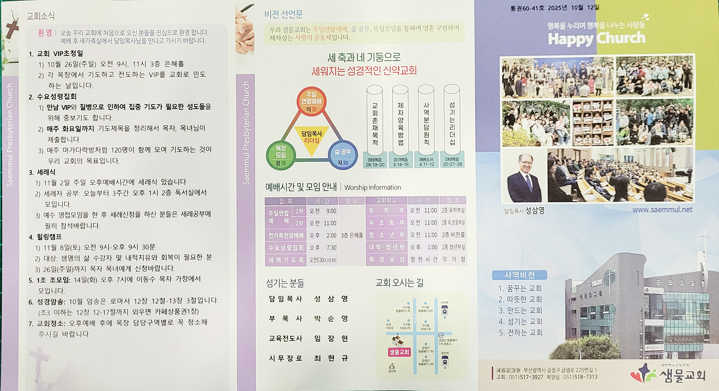 샘물교회 주보(2025.10.12) 페이지 정보 댓글0 조회106 작성일25.10.11 20:19 본문 공유 페이스북 공유 트위터 공유 샘물교회 주보(2025.10.12) 이전글샘물교회 주보(2025.10.19) 25.10.18 다음글샘물교회 주보(2025.10.05) 25.10.04