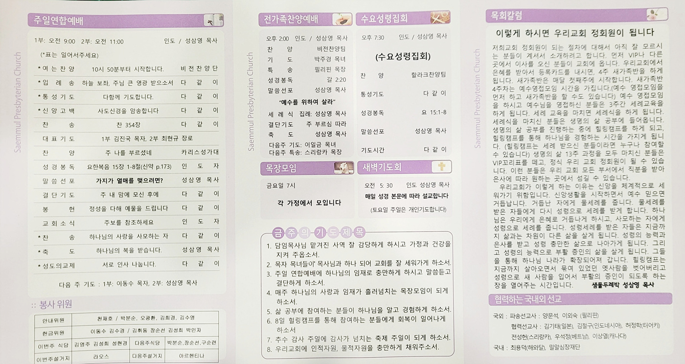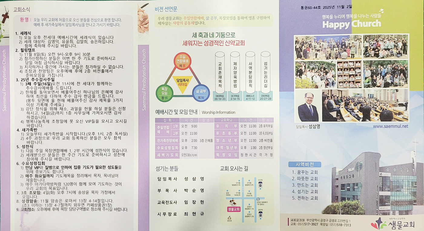 샘물교회 주보(2025.11.02) 페이지 정보 댓글0 조회96 작성일25.11.03 07:14 본문 공유 페이스북 공유 트위터 공유 샘물교회 주보(2025.11.02) 이전글샘물교회 주보(2025.11.09) 25.11.08 다음글샘물교회 주보(2025.10.26) 25.10.25