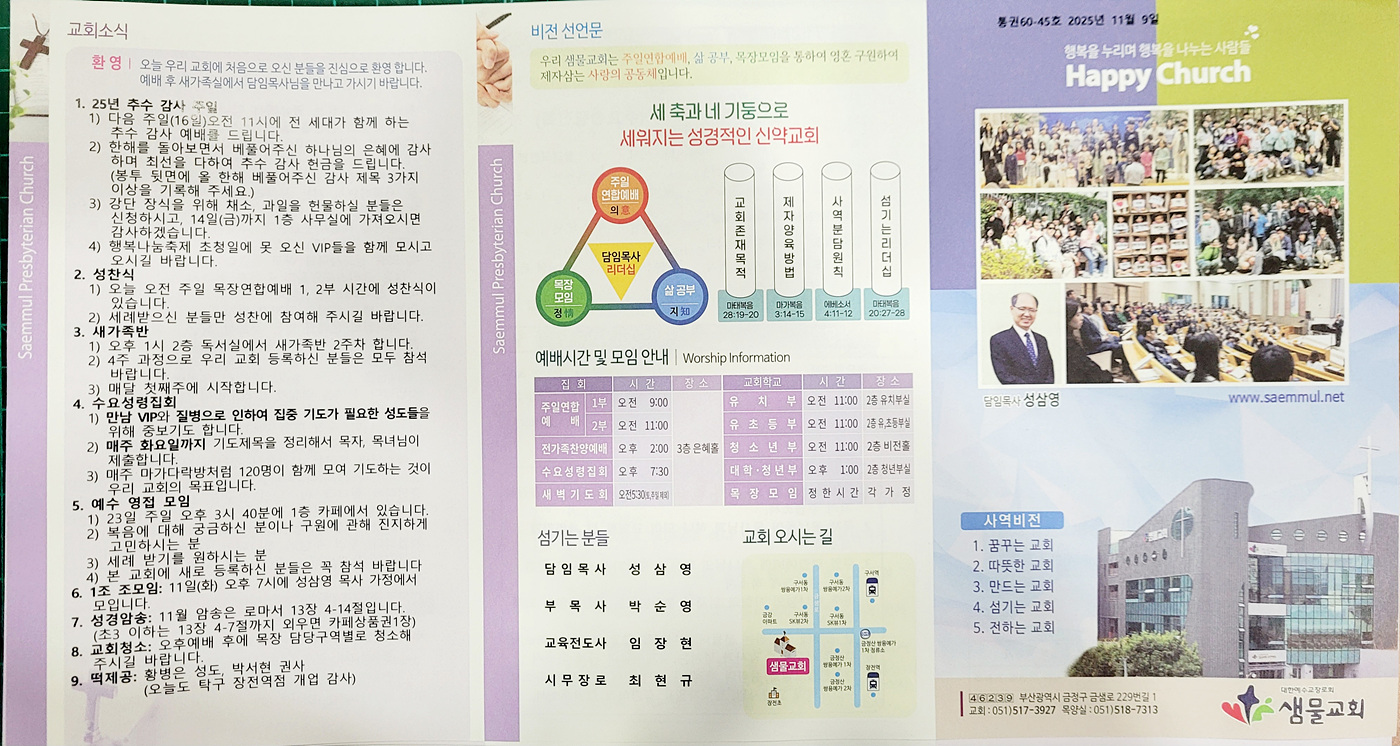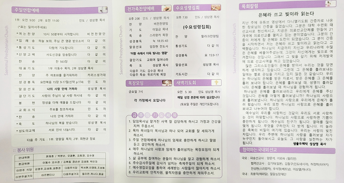 샘물교회 주보(2025.11.09) 페이지 정보 댓글0 조회162 작성일25.11.08 19:22 본문 공유 페이스북 공유 트위터 공유 샘물교회 주보(2025.11.09) 이전글샘물교회 주보(2025.11.16) 25.11.15 다음글샘물교회 주보(2025.11.02) 25.11.03