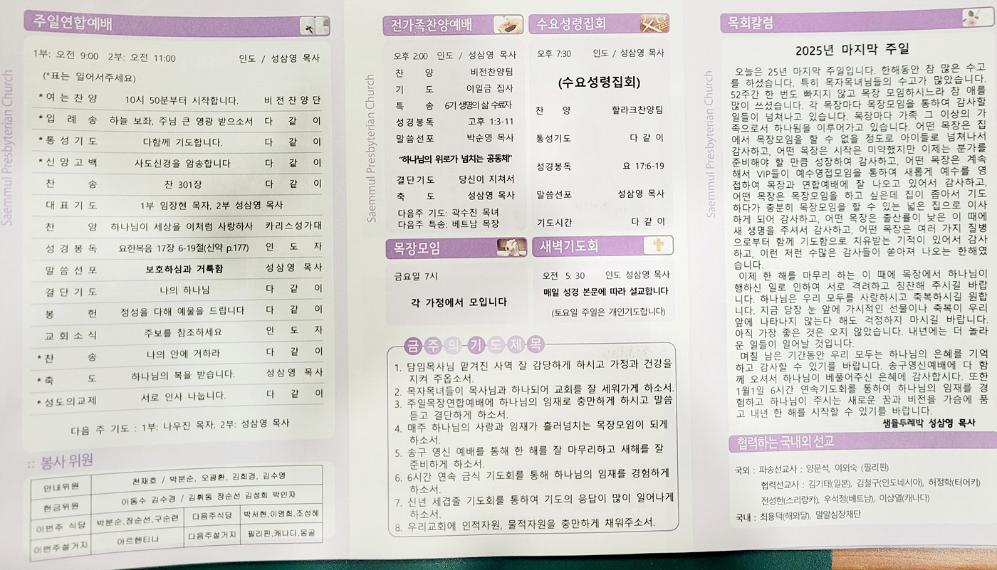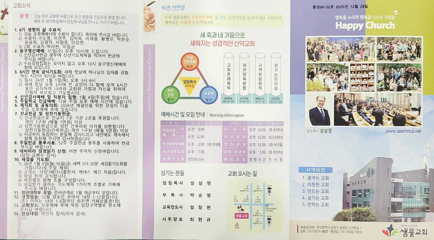 샘물교회 주보(2025.12.28) 페이지 정보 댓글0 조회44 작성일25.12.29 16:42 본문 공유 페이스북 공유 트위터 공유 샘물교회 주보(2025.12.28) 이전글샘물교회 주보(2026.01.04) 26.01.03 다음글샘물교회 주보(2025.12.21) 25.12.20