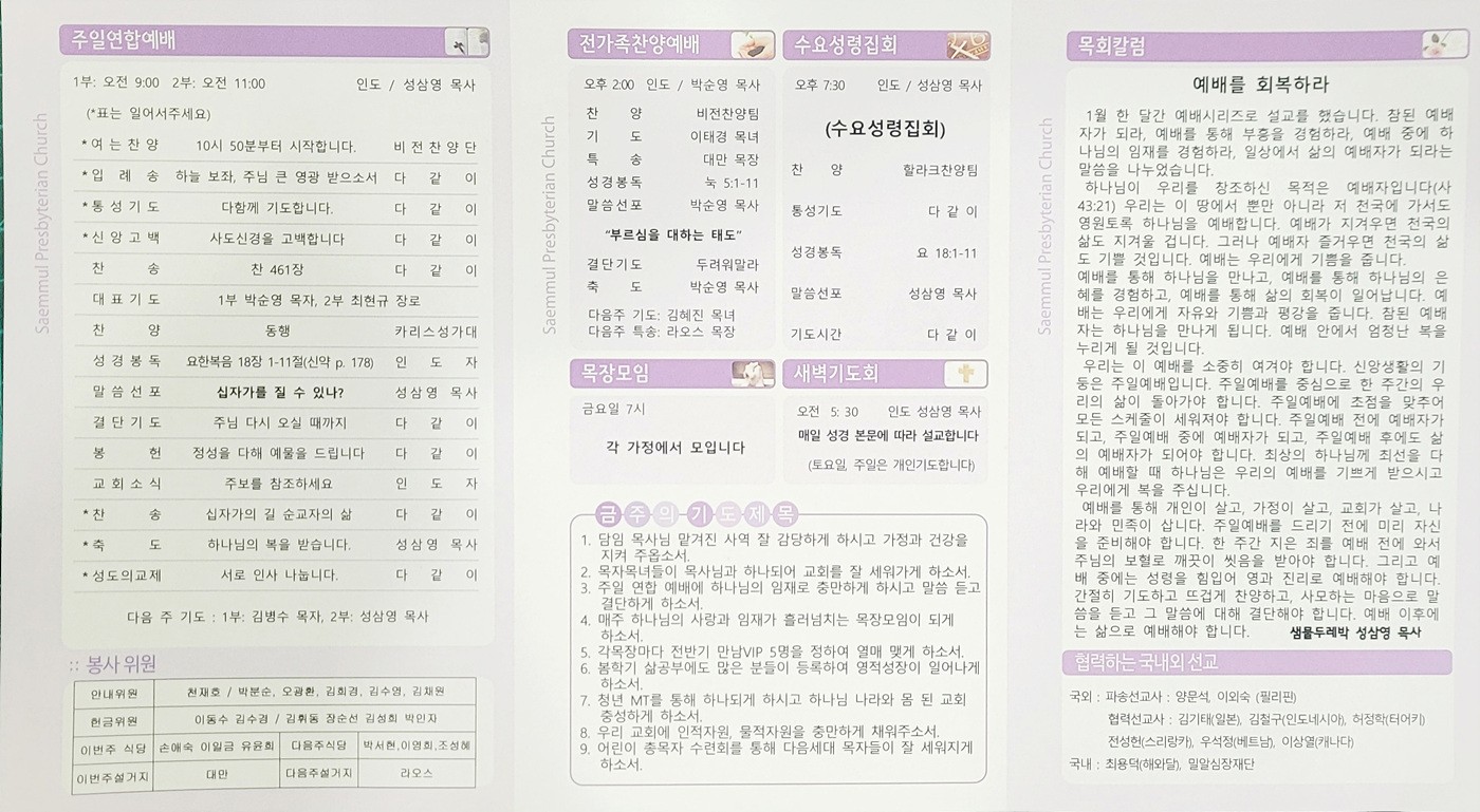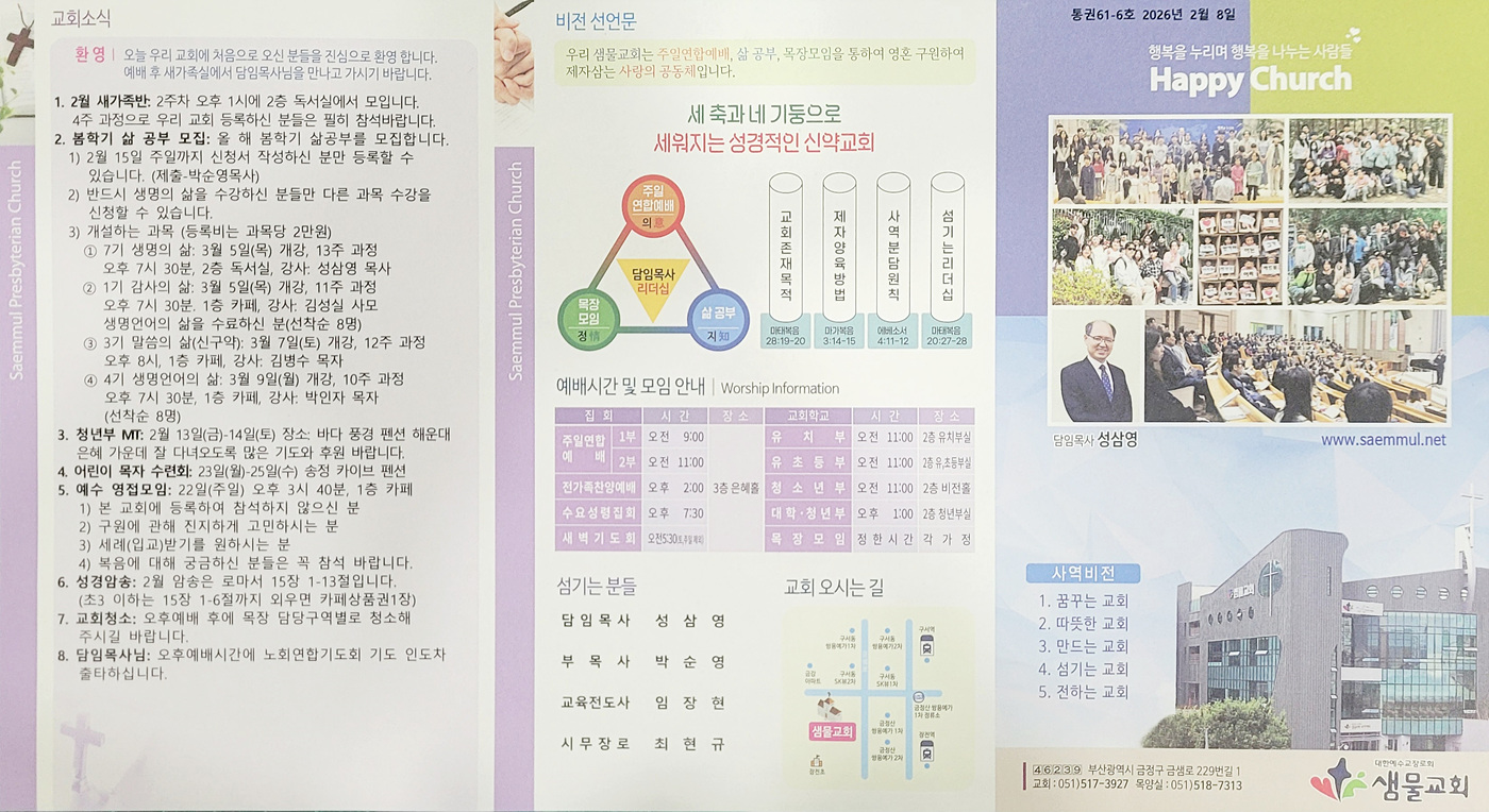 샘물교회 주보(2026.02.08) 페이지 정보 댓글0 조회33 작성일26.02.07 19:46 본문 공유 페이스북 공유 트위터 공유 샘물교회 주보(2026.02.08) 이전글샘물교회 주보(2026.02.15) 26.02.14 다음글샘물교회 주보(2026.02.01) 26.01.31