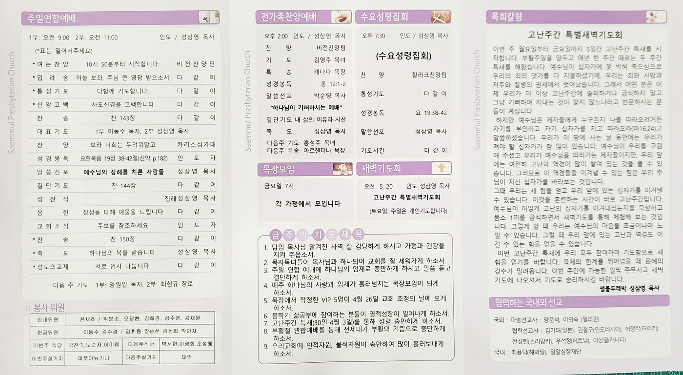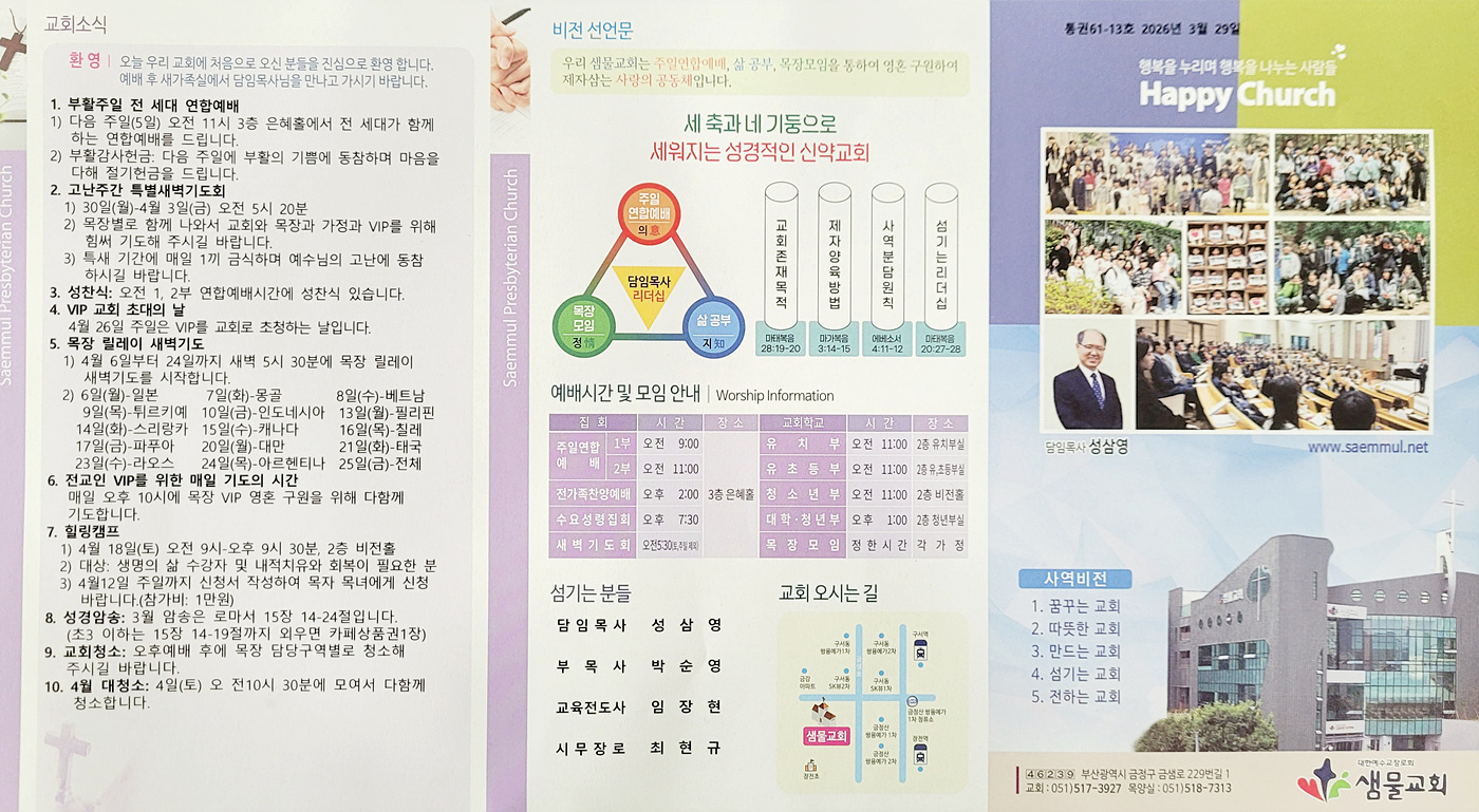 샘물교회 주보(2026.03.29) 페이지 정보 댓글0 조회12 작성일26.03.28 15:05 본문 공유 페이스북 공유 트위터 공유 샘물교회 주보(2026.03.29) 이전글샘물교회 주보(26.04.05) 26.04.04 다음글샘물교회 주보(2026.03.22) 26.03.22