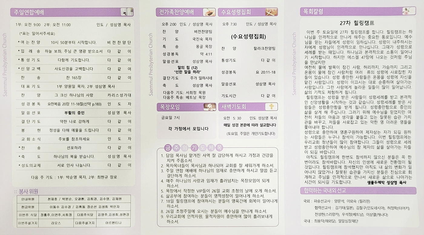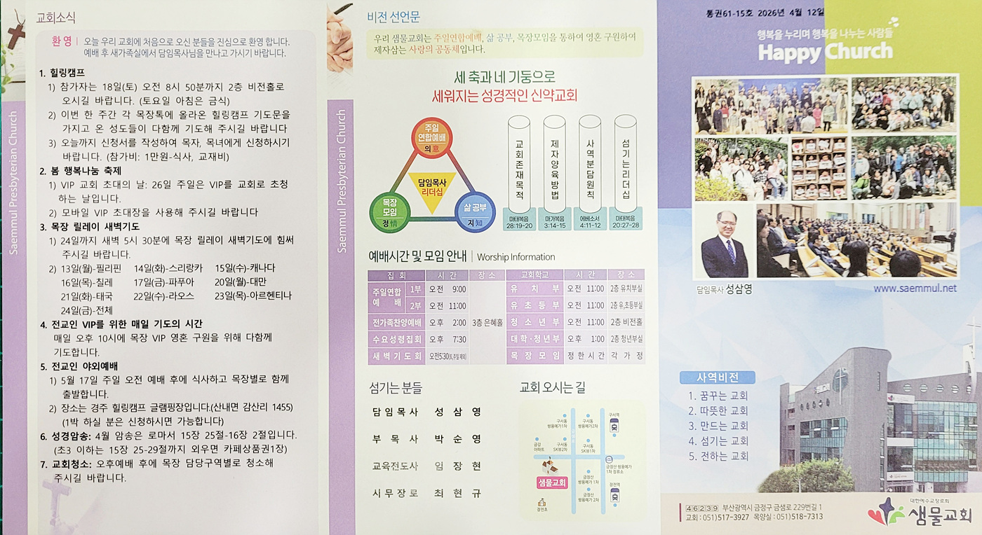 샘물교회 주보(26.04.12) 페이지 정보 댓글0 조회9 작성일26.04.11 22:55 본문 공유 페이스북 공유 트위터 공유 샘물교회 주보(26.04.12) 이전글샘물교회 주보(26.04.19) 26.04.18 다음글샘물교회 주보(26.04.05) 26.04.04
